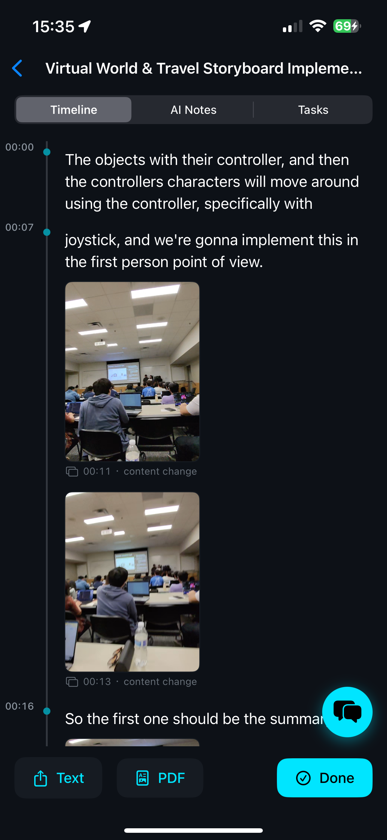 - Polished Timeline — AI-refined transcript with embedded images, highlighted bookmarks, and persistent section headers.