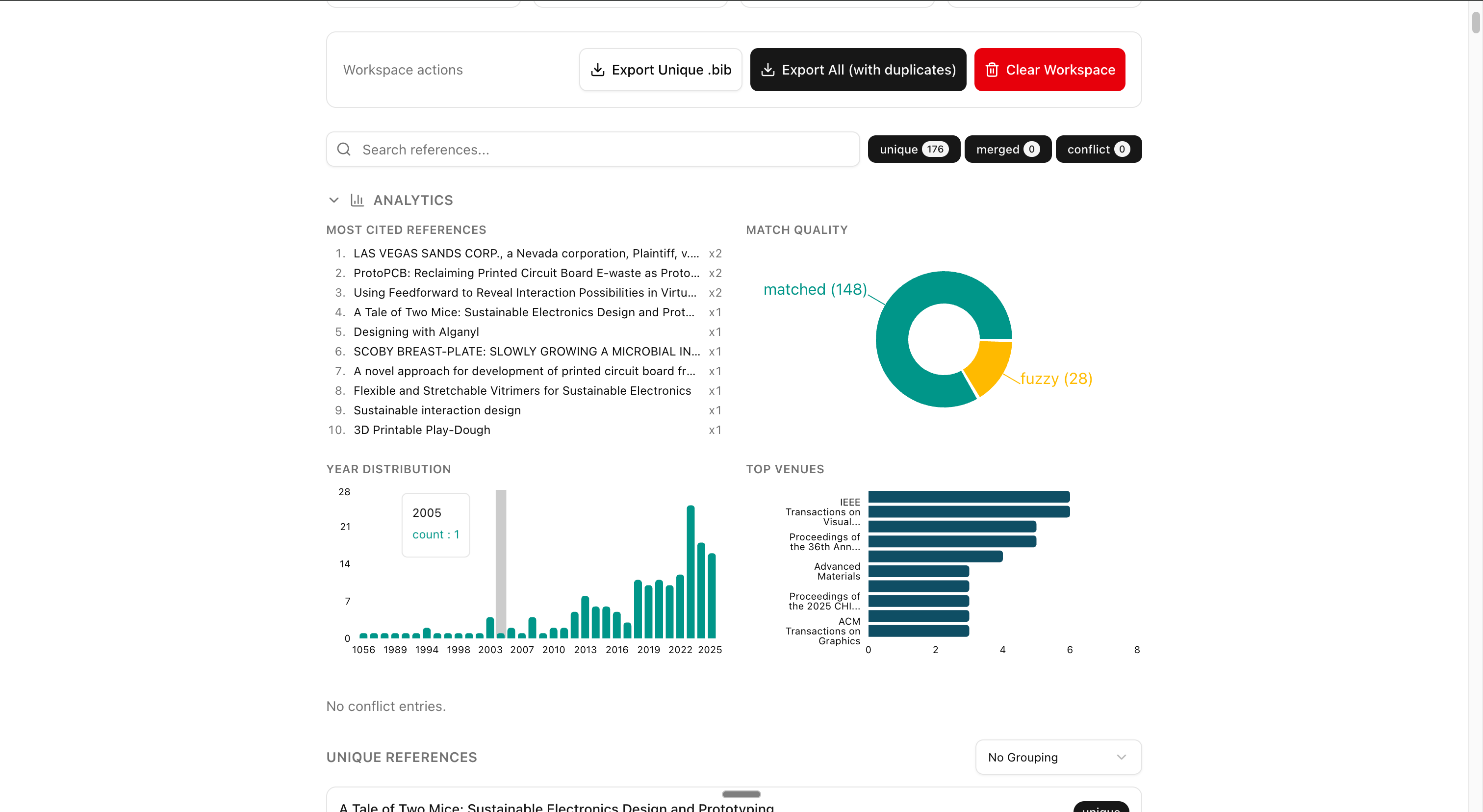 - Analytics — Citation year distribution, venue breakdown, match quality donut chart, and most-cited references ranking.