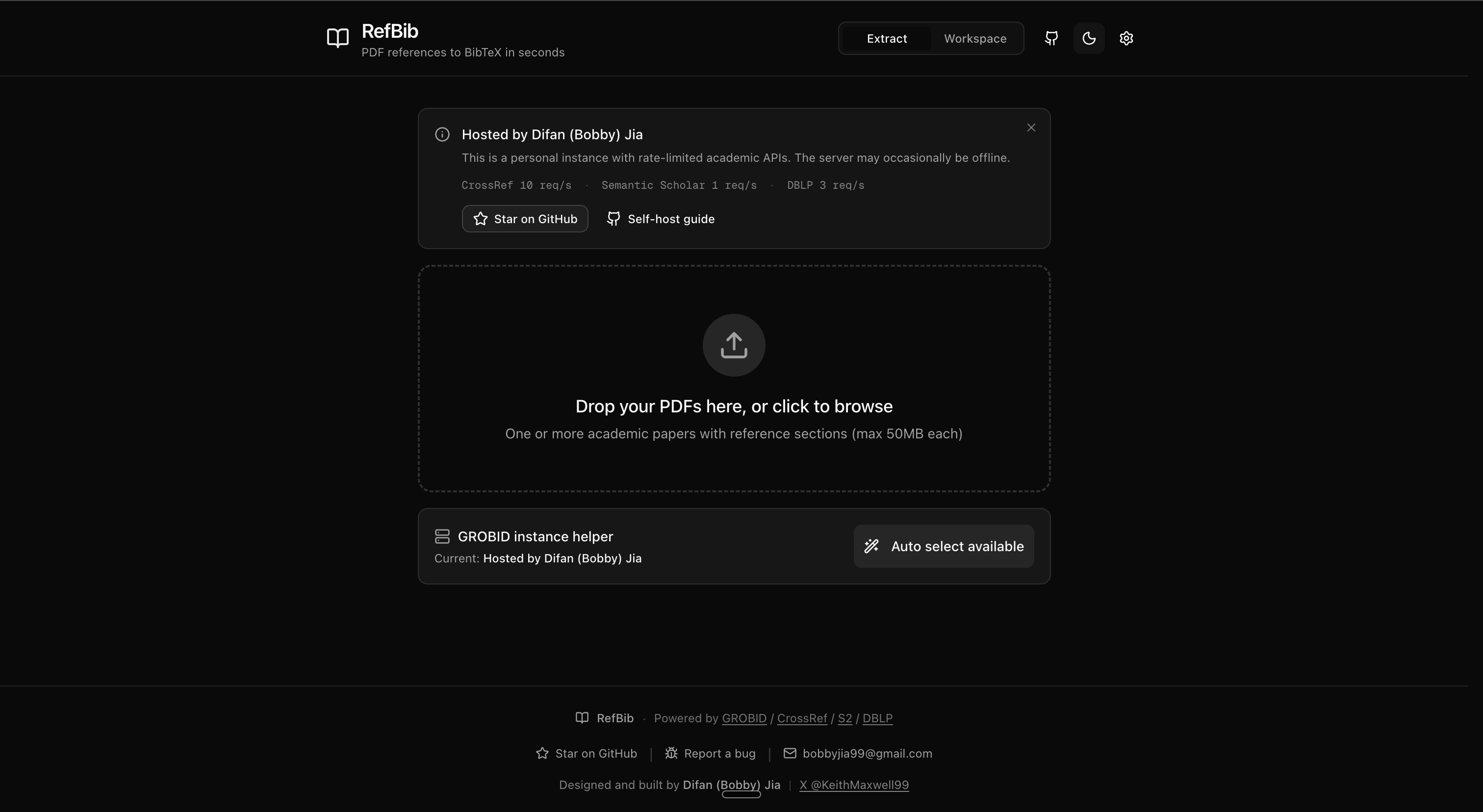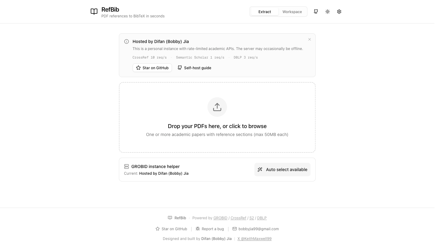 RefBib extracts references from academic PDFs and resolves them into standardized BibTeX entries — in one click. No LLMs, no hallucinated metadata. Every citation is verified against real academic databases: CrossRef, Semantic Scholar, DBLP, or GROBID's structured parsing.